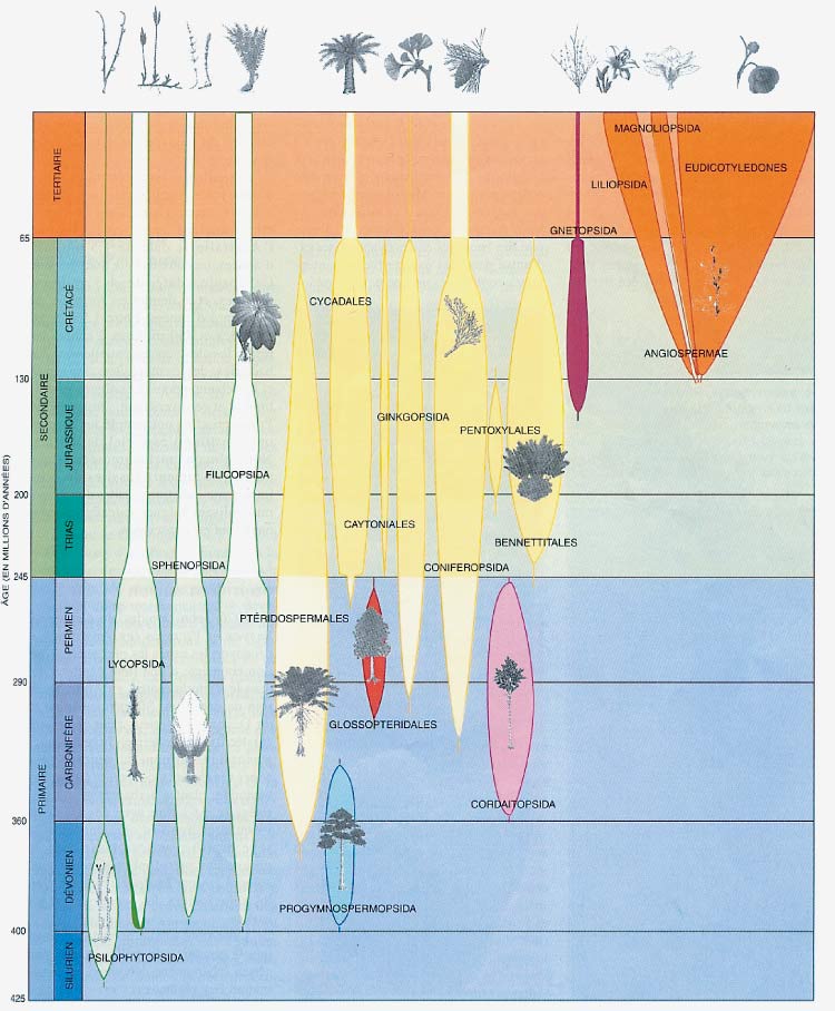 Á partir de ces innovations végétales, entre 400 et 250 millions d'années, les ptéridophytes ont dominé les flores terrestres du Primaire avec des formes herbacées, arbustives et arborescentes. Parmi ces dernières, Lepidodendron et Sigillaria pouvaient atteindre plusieurs dizaines de mètres de hauteur. Á la fin du Dévonien (vers 365 millions d'années), on note l'arrivée des Gymnospermes, avec les préspermatophytes d'abord, dont il ne reste que de rares représentants actuels tels que les genres Cycas ou Ginkgo (aujourd'hui devenues des plantes décoratives de jardins sous nos latitudes). Ces préspermatophytes sont caractérisés par des "ovules nus", non fécondés, riches en réserves nutritives et des cellules sexuelles mâles mobiles. Puis au cours du Carbonifère (de 360 à 290 millions d'années) apparaissent les conifères (gymnospermes spermatophytes), dont certains présentent des feuilles rappellant déjà l'allure caractéristique d'aiguilles que nous leur connaissons aujourd'hui. Les ptéridophytes très abondantes à l'ère Primaire sont associées à des environnements humides parfois même marécageux qui sont abondants du fait du climat et du contexte paléogéographique au Carbonifère. Á partir du Permien, le climat change, il devient plus sec et plus chaud alors que la configuration paléogéographique évolue vers la réunion de toutes les terres émergées en un seul supercontinent (la Pangée). Les lagunes marécageuses régressent et, avec elles, les ptéridophytes au profit des gymnospermes. Ce groupe domine alors les flores continentales durant toute l'ère Secondaire, avec les préspermatophytes évoquées plus haut et les spermatophytes avec les conifères. Ces spermatophytes émettent une "graine nue" qui contient des réserves et une plantule, c'est à dire un oeuf fécondé ayant démarré son développement. Les cellules sexuelles mâles ont perdu leur mobilité et atteignent la cellule femelle grâce à un tube pollinique émis par un grain de pollen. Ce n'est que durant le Crétacé, vers 140 millions d'années qu'apparaissent les angiospermes ou plantes à fleurs. Leur extension rapide s'accompagne de la disparition de nombreuses gymnospermes, préspermatophytes surtout, et d'un renouvellement parmi les conifères.