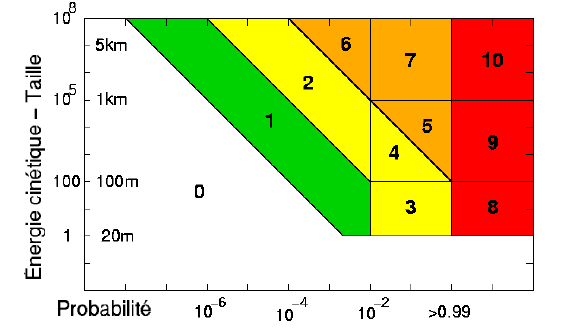 - 0. Le risque de collision est nul ou bien en deçà de la chance d’avoir un objet aléatoire de la même taille qui va heurter la terre au cours de ces prochaines décennies. Cette catégorie est attribuée à tout objet qui, dans le cadre d’une collision éventuelle, n’a aucune chance d’atteindre la surface de la terre intacte.